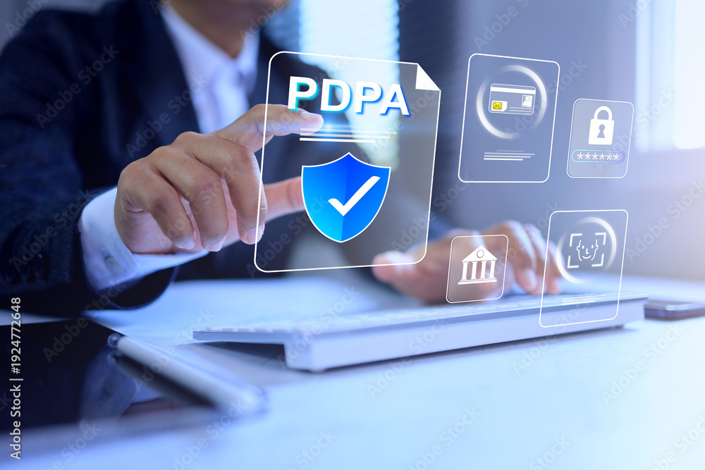 personal data protection act PDPA law concept with businessman pointing on virtual screen to manage confidential identify person, biometric facial recognition to complied requirement