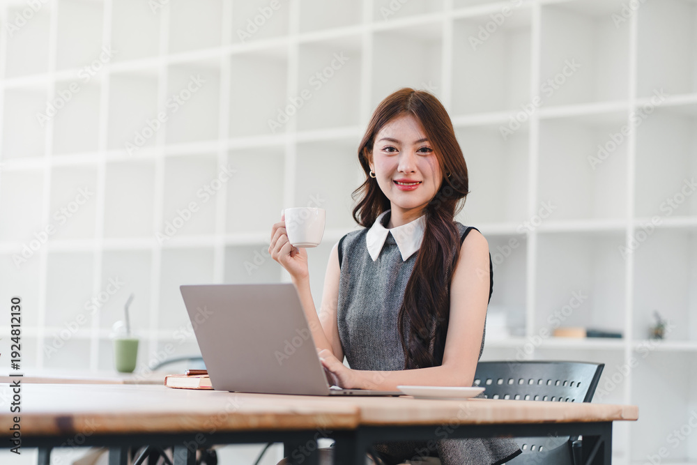 Happy young asian woman business professional sitting at desk with laptop holding coffee cup in office looking at camera with confident smile