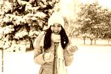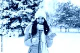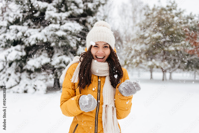 Laughing woman playing with snow while walking in park