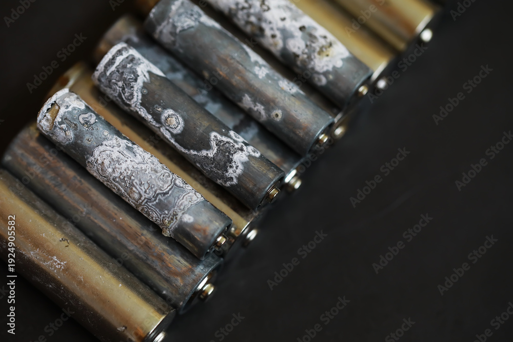 Close-Up of Corroded Batteries: Environmental Impact and Recycling Challenges in Stock Photography
