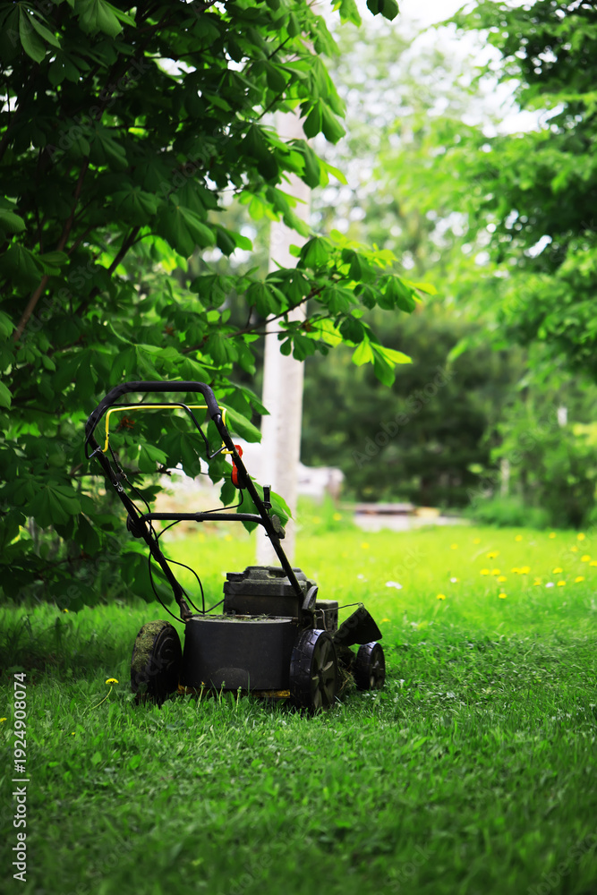 Vintage Push Lawn Mower in Vibrant Green Garden on a Sunny Day