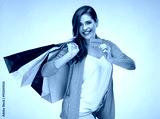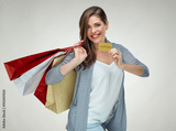 Smiling woman holding credit card with shopping bag