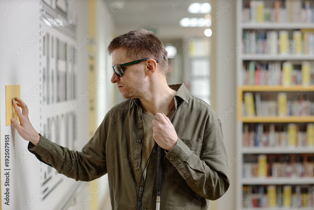 Middle aged Caucasian man wearing sunglasses navigating library using cane and touching tactile sign on wall, demonstrating independent orientation skills in public space
