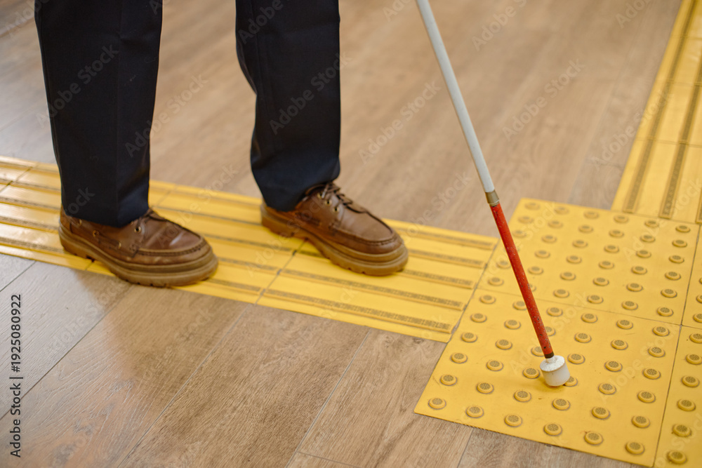 Middle aged Caucasian man using cane for navigation inside library, feet standing on tactile paving for visually impaired, demonstrating accessibility features for blind individuals