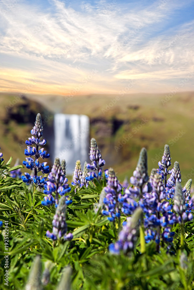 Magical majestic dramatic scenic landscape with lupine flowers on background of waterfall Skogafoss in Iceland. Exotic countries. Amazing places.