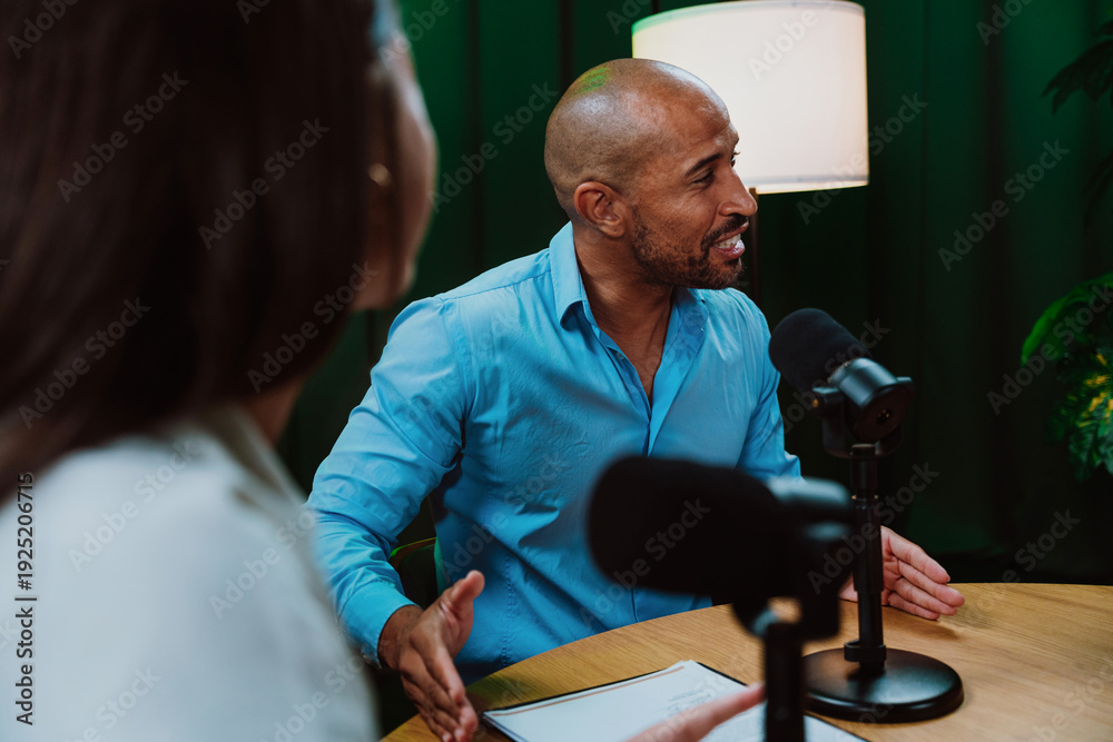 Group of three diverse hosts having a podcast discussion