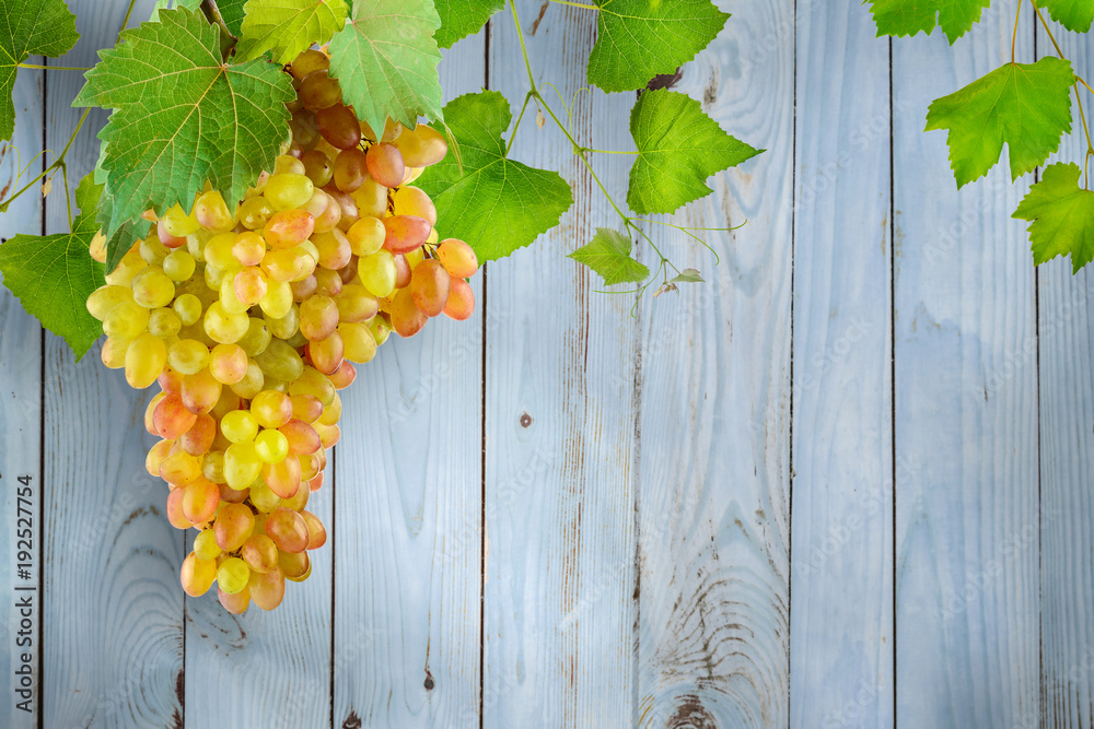 Bunch hanging grapes with green leaves against background light blue wooden wall made boards.