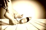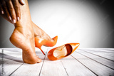 A woman's tired and aching feet and high-heeled shoes on a wooden floor