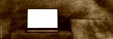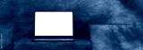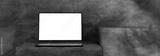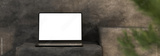 3D Blank laptop screen mockup placed on stone stand with textured wall Responsive Web Design
