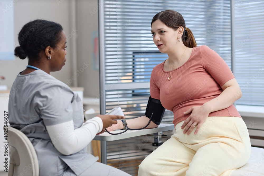 Caucasian pregnant young adult woman sitting while Black female healthcare worker measuring blood pressure using medical device in clinical setting during prenatal checkup