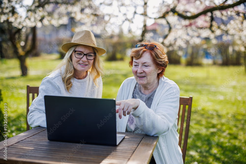 Adult daughter showing laptop to senior mother in spring garden. Happy multi-generation family using technology together during sunny day outdoors