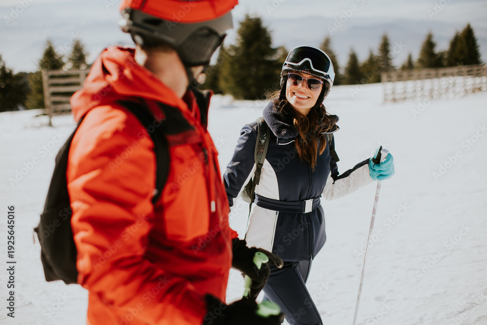 Couple enjoys a winter day while skiing on a snowy mountain trail in the afternoon