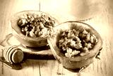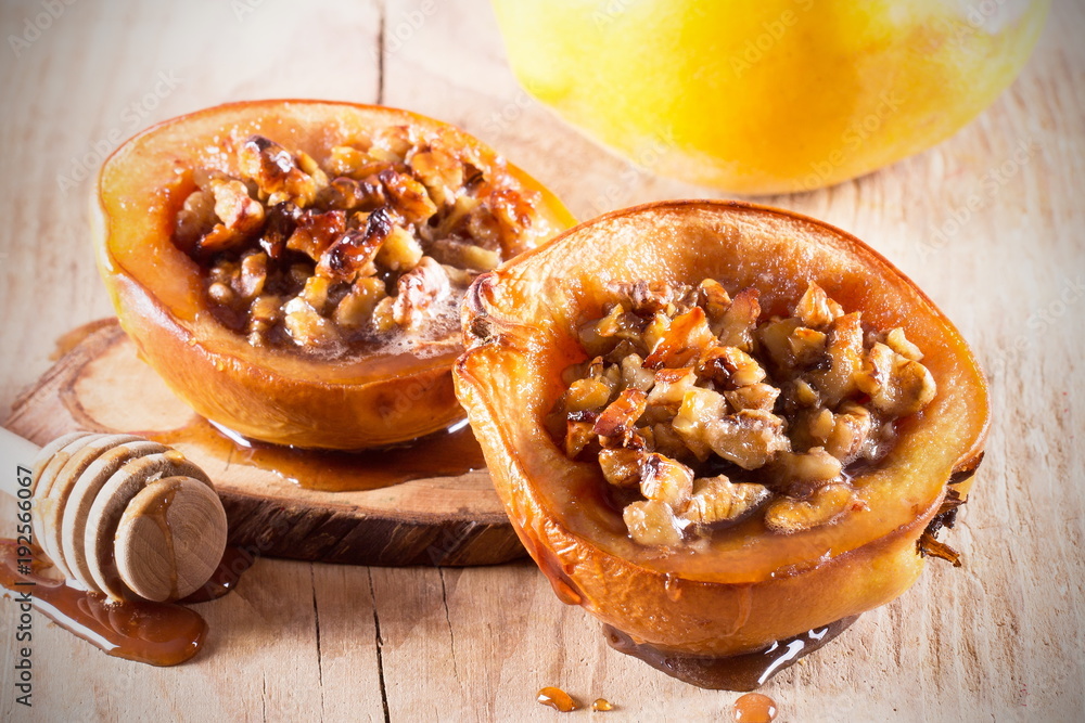 айва запечённая с мёдом и орехами лежит на столе