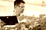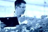 Scientist wearing safety goggles uses tablet to inspect strawberry plants in greenhouse