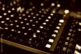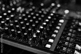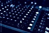 Professional Audio Mixing Console with Colorful Control Knobs in Blue Neon Lighting