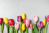 Beautiful colorful tulip flowers on light grey background, flat lay. Space for text
