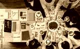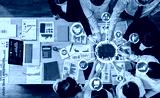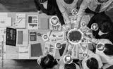 A top view of a diverse group engaged in a collaborative business meeting, analyzing data and discussing strategies with modern technology in a dynamic office environment. Amity