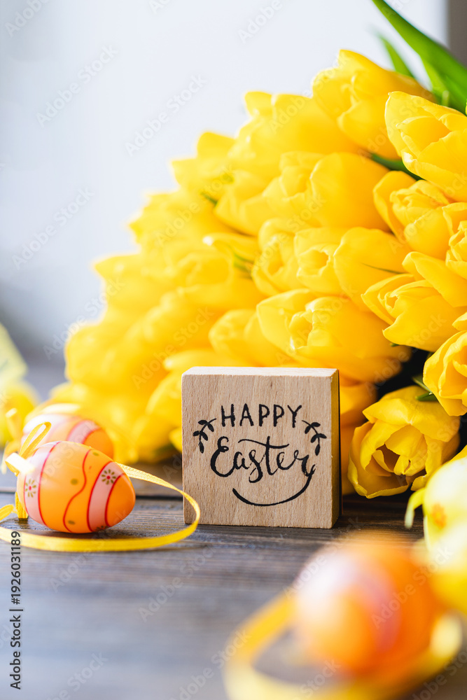 Spring festive composition with yellow tulips and decorative eggs in natural tones. Easter holiday, springtime, renewal, warmth and joy concept. Minimalistic style.