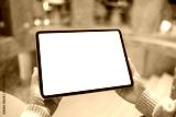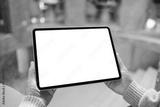 Mockup image of a woman holding digital tablet with blank white desktop screen