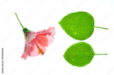 Isolate pink chinese rose with leaves, a close up photo image of pink chinese rose with them upper side leaf and lower side leaf isolated on bright white light background