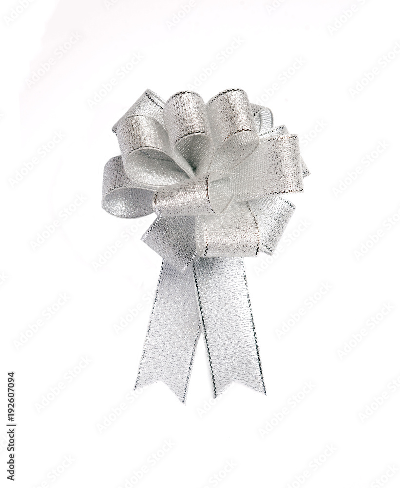 Isolated bow, silver color silk bow isolated on white background, luxury silver color ribbon bow for decorate in christmas or new year time, gift box decoration, wrapping accessories, award decorative