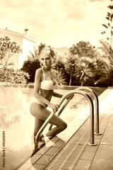 A young woman with perfect body girl in lingerie posing at the swimming pool outdoors on summer day