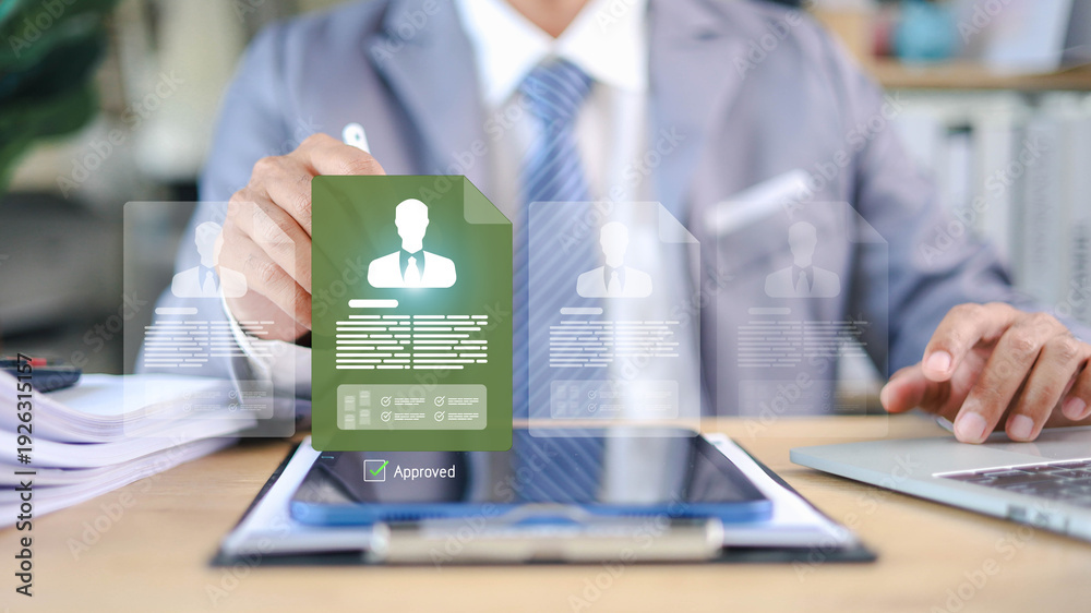 HR manager approving digital employee profile on recruitment system. Concept of candidate verification, hiring process, and workforce management.