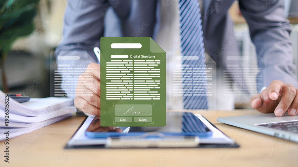 Businessperson signing digital contract with electronic signature interface. Concept of e-document approval, online agreement, and fintech security.