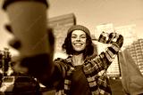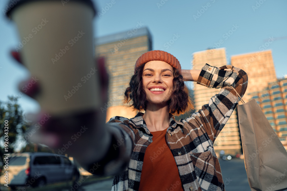 Woman smile coffee shopping urban candid beanie portrait: a joyful moment of authenticity and mindful living, golden hour glow and emotional storytelling in a casual city street scene.