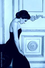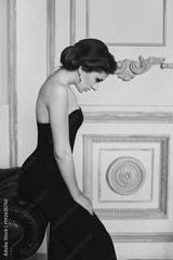 Fashionable and beautiful brunette model girl in black dress posing at luxury background, indoors