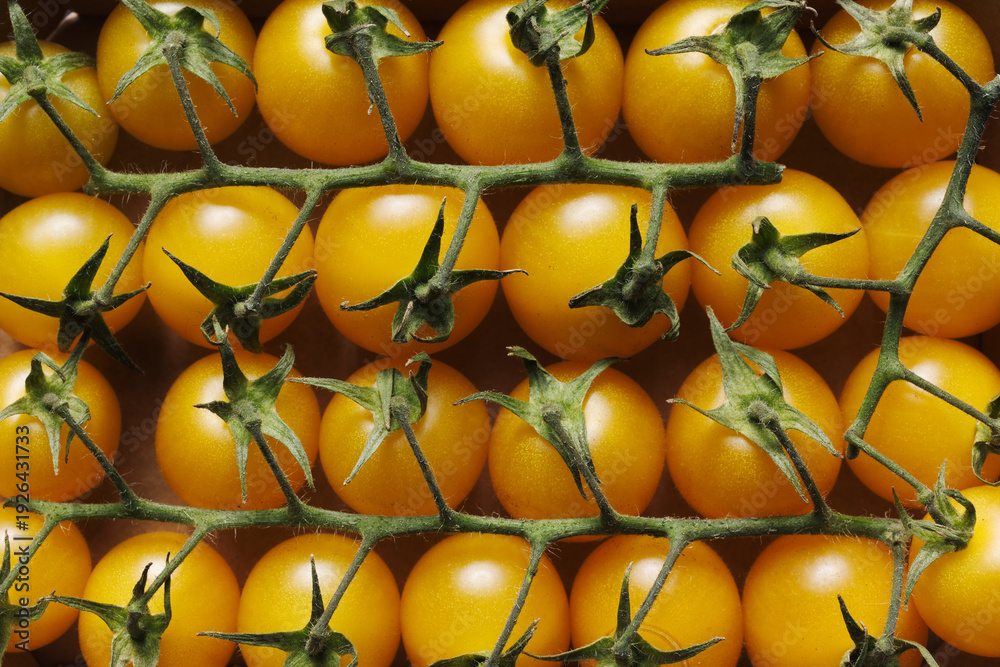 Fresh yellow cherry tomatoes on branches, close-up. Tomato background.