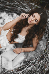 Portrait of beautiful brown-haired sexy model girl wearing lingerie, rests in a huge nest in the green fairytale forest