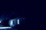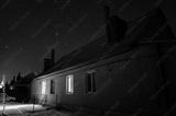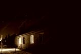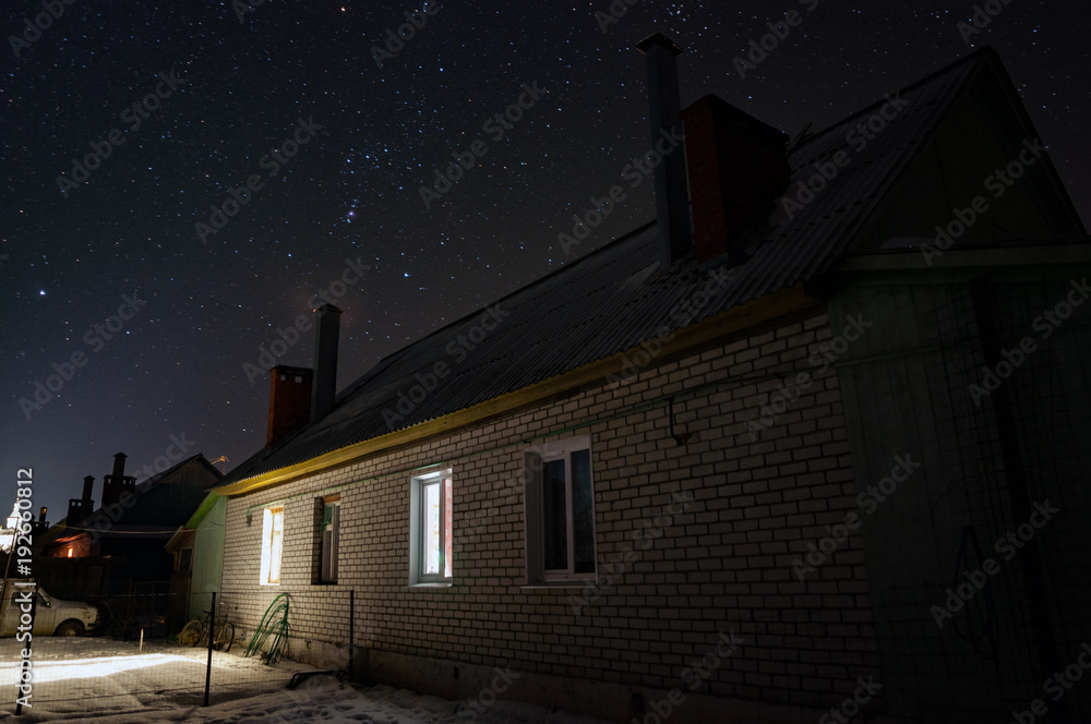House in the Russian village frosty clear night. Orion's constellation is in the starry sky. Lights up in the Windows and the pipe is smoke.