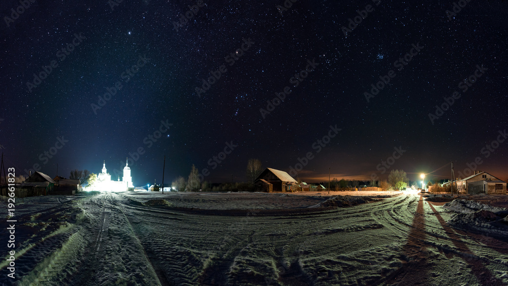 The road in the Russian village. Frosty, winter night. Much snow. Many stars in the sky and the constellation of Orion. The Orthodox Church is illuminated in the distance.