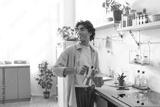 Young man with curly hair enjoys a peaceful morning at home with coffee