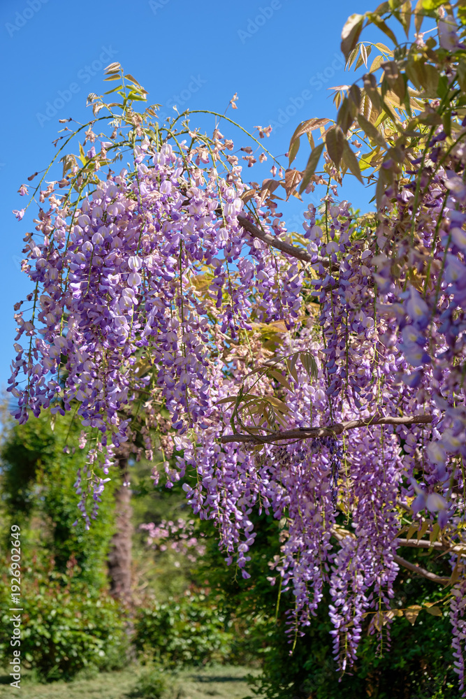 Blooming lilac Wisteria in the Sochi Arboretum in spring.