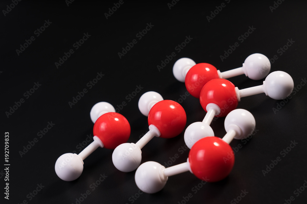 Chemistry model atom of molecule water scientific elements. Integrated particles hydrogen and oxygen atom on black background. Chemistry conceptual plastic model for education.