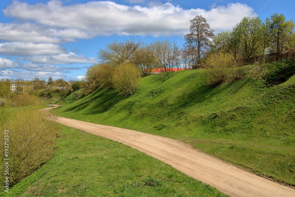 Wiosenny pejzaż, świeża zieleń, drzewa, krzewy, trawa, pofałdowane małe wzgórza porośnięte zielenią, piaszczysta ścieżka, w tle domy pośród drzew, niebieskie niebo z pięknymi chmurami