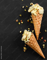 Two vanilla ice cream in waffle cone with nuts on black