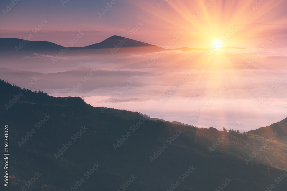 Beautiful landscape in the mountains at sunrise. View of the foggy hills covered by forest. Retro effect. Traveling concept background.