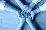 Couple with adopted girl holding hands on table, top view