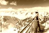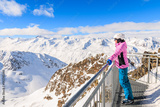 Young woman skier looking at mountains from viewpoint platform in Hochgurgl-Obergurgl ski area, Tirol, Austria