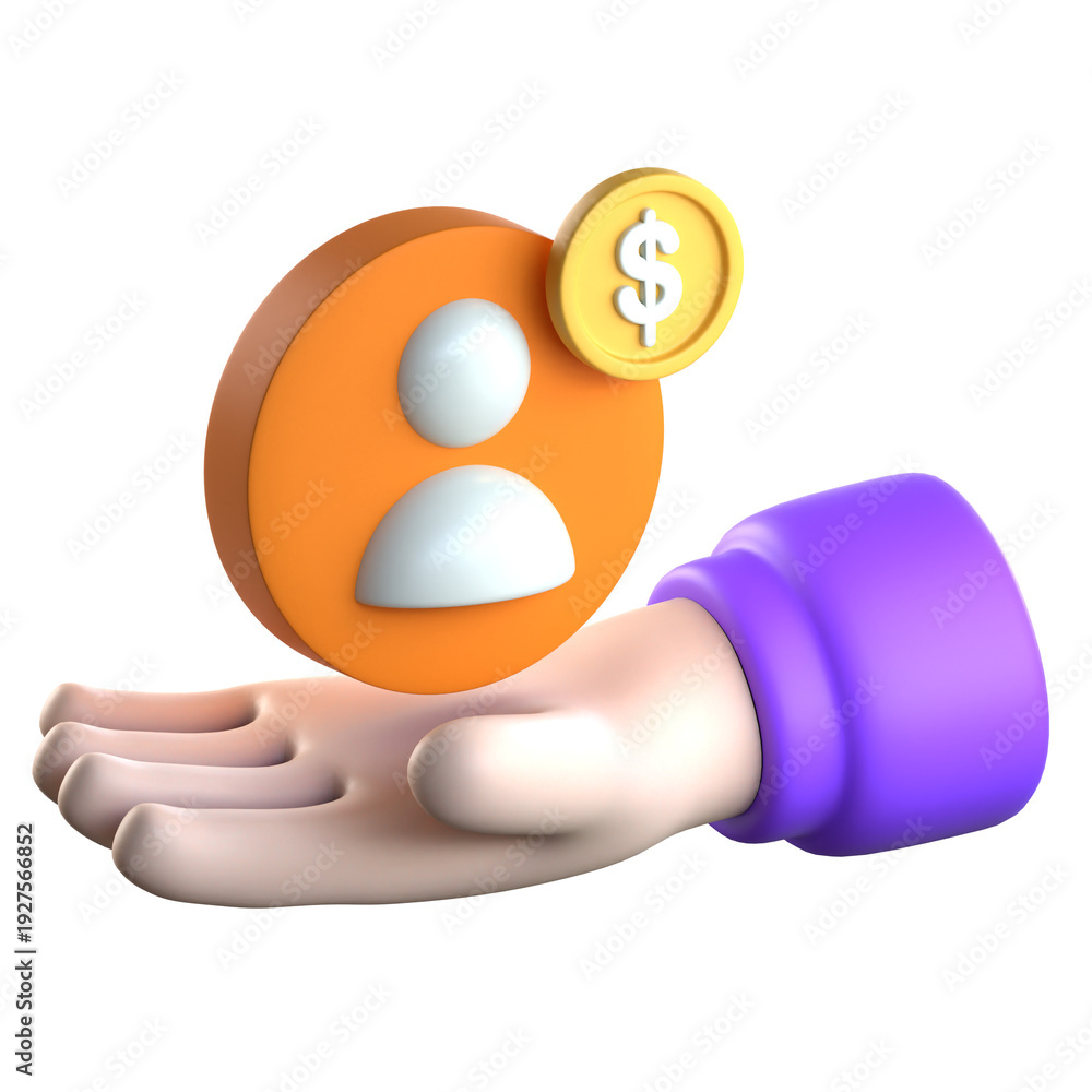 A 3D hand supporting a user profile symbol and a dollar coin representing employee salary distribution and human resources