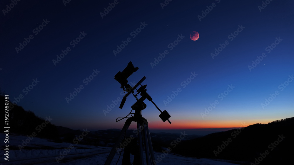 Amateur astrophotography equipment with camera, tripod star-tracker for photographing stars, planets and Moon.