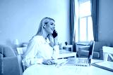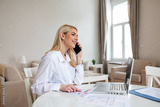 Professional woman talking on phone while working on laptop at home. Smiling female executive discussing business reports and data. Remote work, technology and communication concept. Office desk.