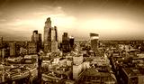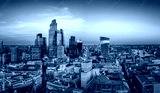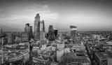 Aerial view of the City of London, UK, skyline from Bank until Tower Bridge with office skyscrapers reflecting the sunlight during sunset