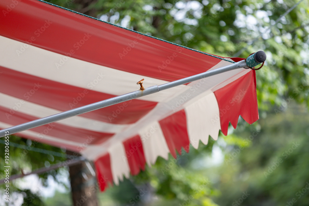 white and red striped awning of shop with tree background. exterior canvas roof shading for sun protection.