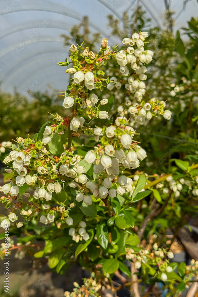 Blooming blueberry bushes in pots inside a professional greenhouse farm