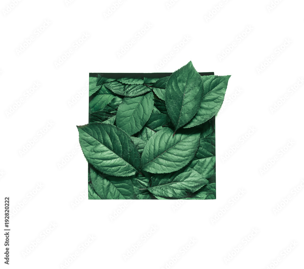 Creative layout made leaves with white paper frame. Flat lay. Nature concept