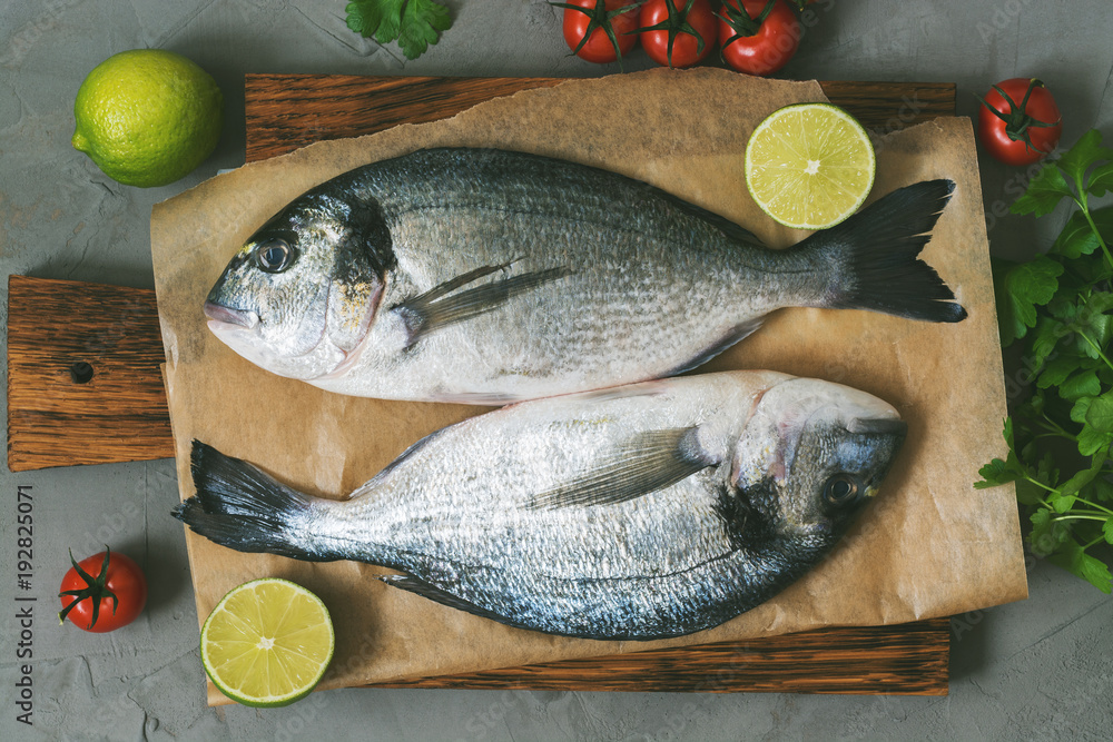 Raw fish on a cutting board with cherry tomatoes, parsley and lime. Top view.